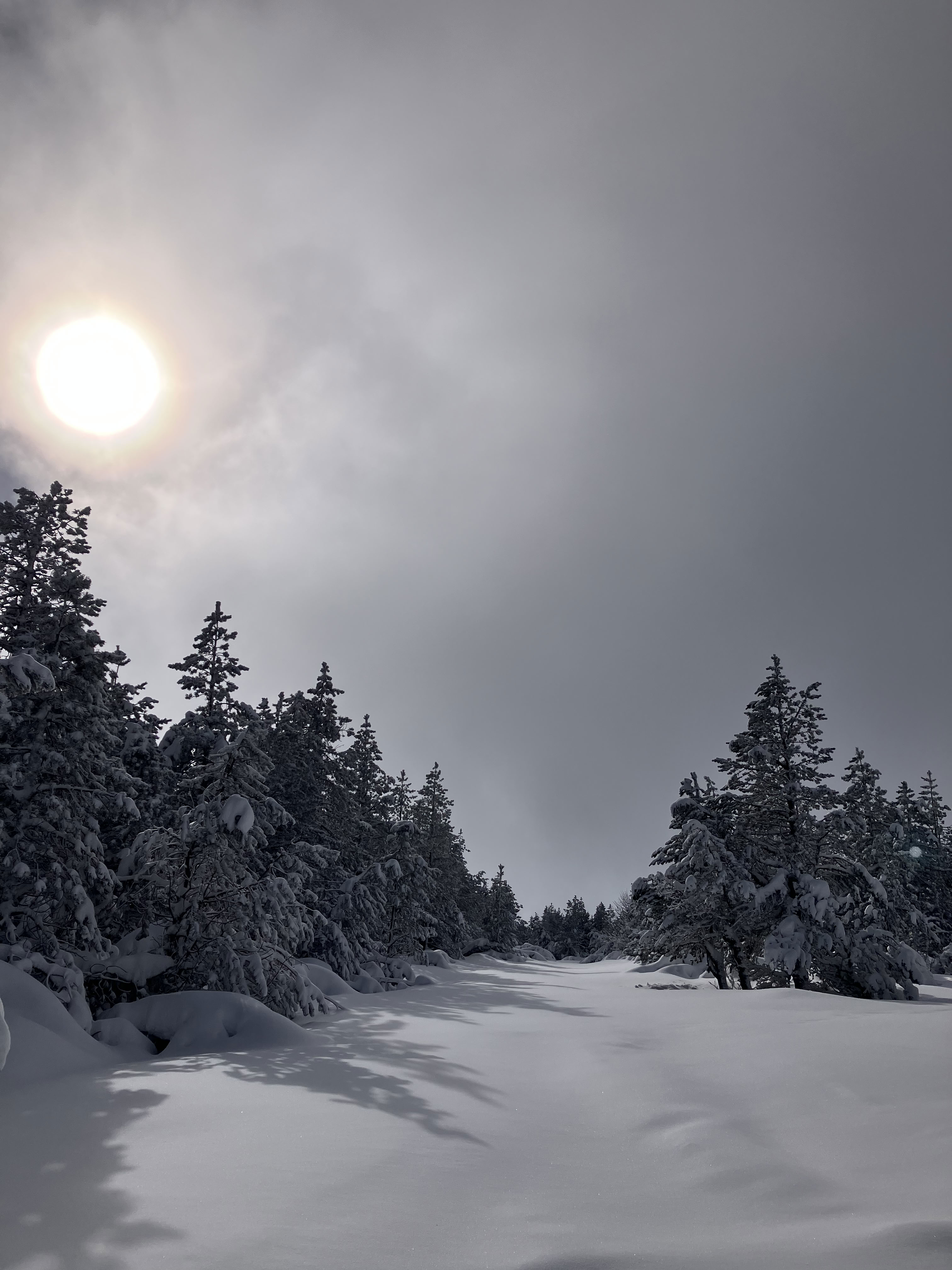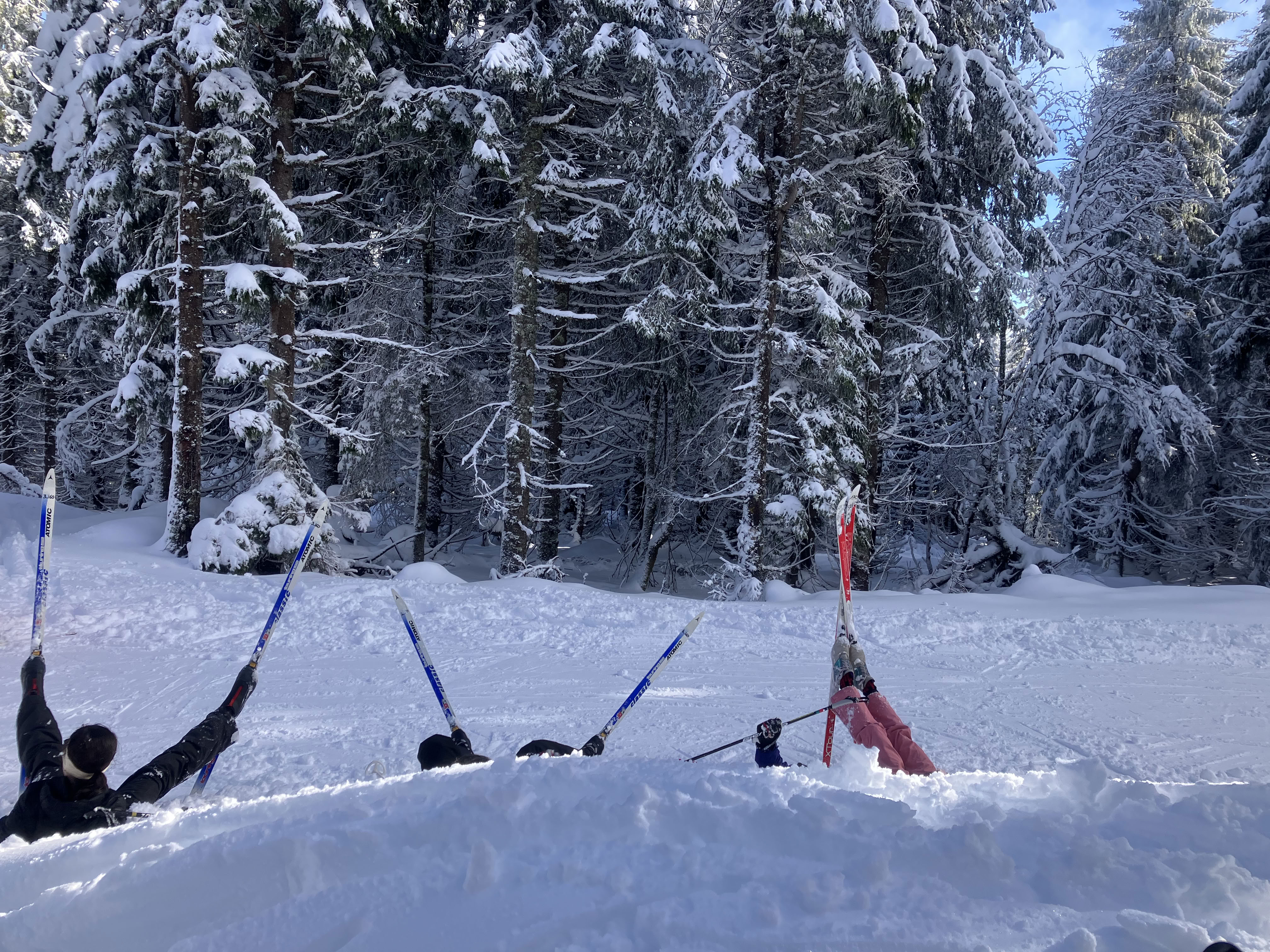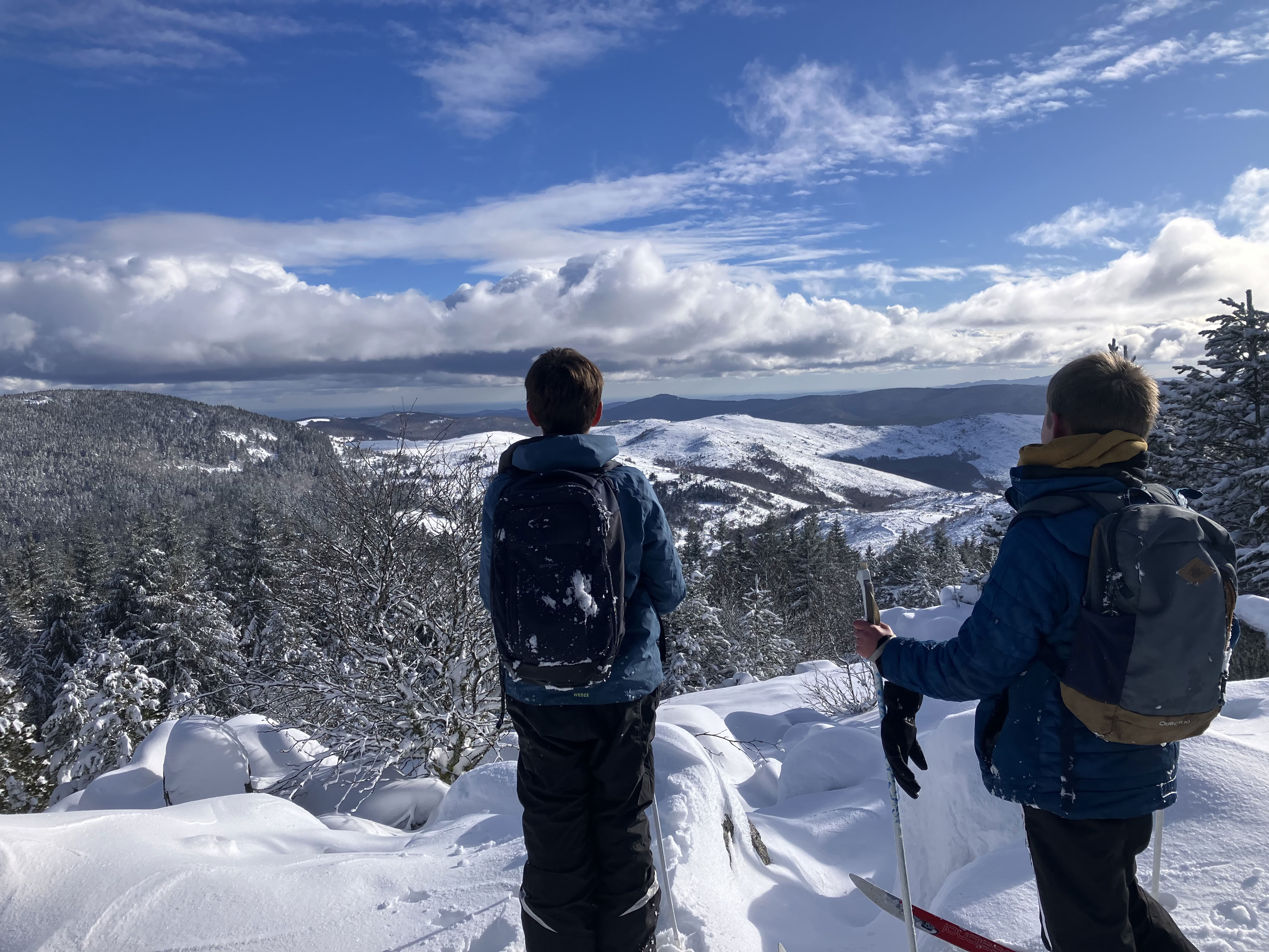 Après un pique nique à la salle hors sac de la station de ski alpin, nous avons rejoins la station de ski fond de Finiels pour essayer chaussures et skis. Et nous voilà partis sur la piste bleue en essayant d'apprivoiser ce nouveau mode de déplacement qui semble facile mais qui s'avère au final plus complexe que prévu. Chacun allant à son rythme, nous avons traversé une forêt de sapins ou la neige fait plier les branches et ou règne calme et tranquillité.
